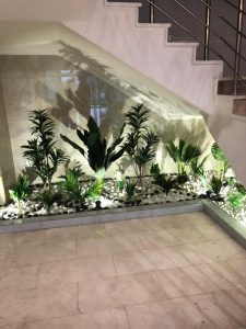 زراعة النباتات: اختيار نباتات وأزهار تتناسب مع بيئة المنطقة وذوق العميل.